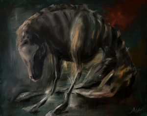 In the dirty work, where hands are soaked in the dirt of suffering, a cruel reality is revealed. The suffering of living beings becomes a heavy burden that hangs like dark clouds over the work field. In this gloomy urban scene, an undefined being appears, a shadowy silhouette that represents universal suffering. Its form remains vague, but the posture speaks of a deep, unspeakable pain anchored in the murky waters of dirty work.