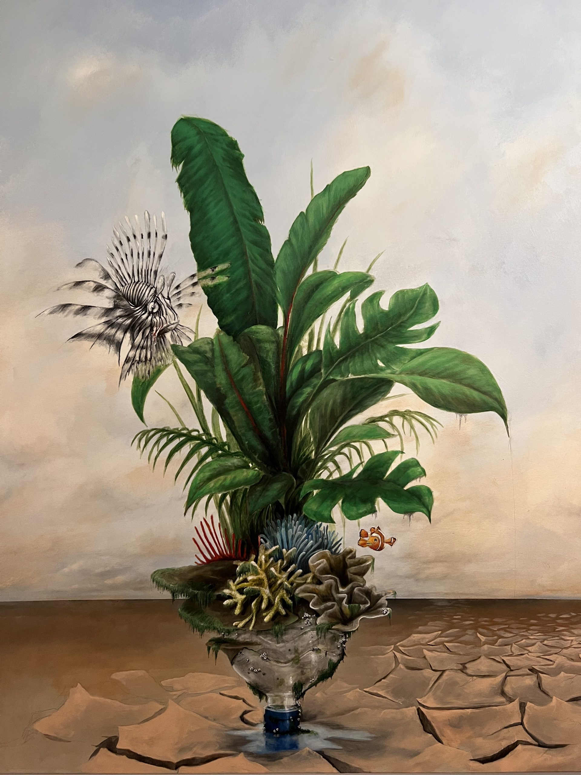 In a parched landscape, a sliced plastic bottle protrudes, symbolizing the irony of human impact on the environment. Once a contributor to dehydration, it now paradoxically serves as the sole source keeping the last survivors—two fish and some plants—alive. A clownfish is meant to enhance the humor. A black and white lionfish floats alone in its limited habitat, while the plants are arranged in a formation reminiscent of intricately decorated cutlery. The distinctive appearance of the fish amplifies the image of prepared cutlery. Yet, behind the presumed grace of the lionfish lies a dark truth: it represents a threat that has spread like a parasite in the seas, and its toxicity poses a beautiful, peculiar, yet invisible threat to the depicted fragile ecosystem.